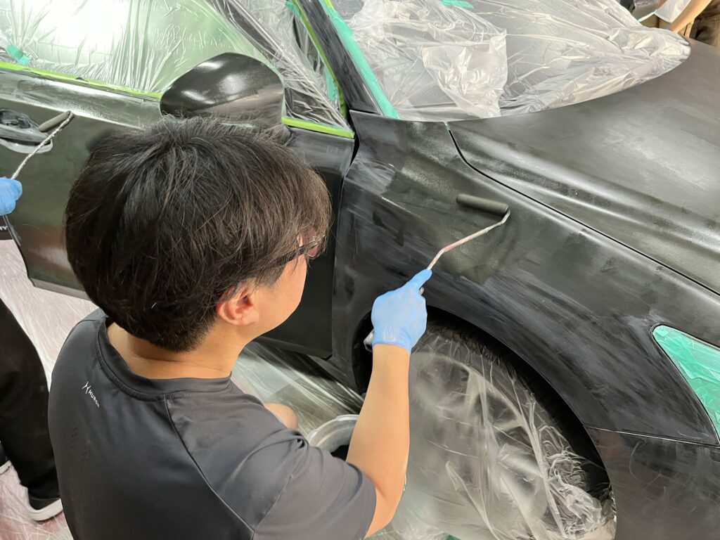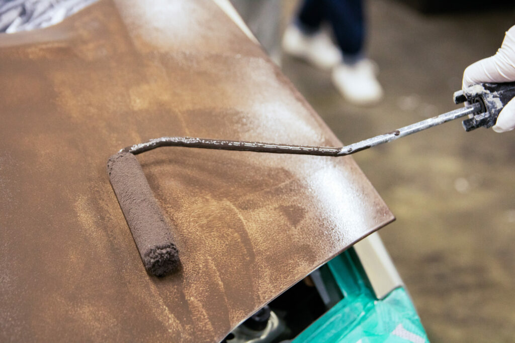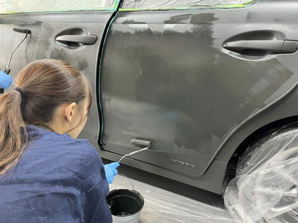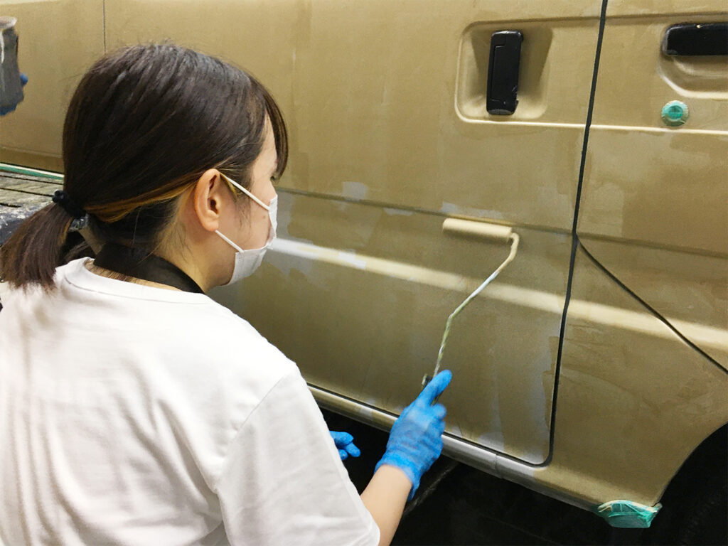 塗装が剥がれた車を刷毛とローラーで補修塗装する手順