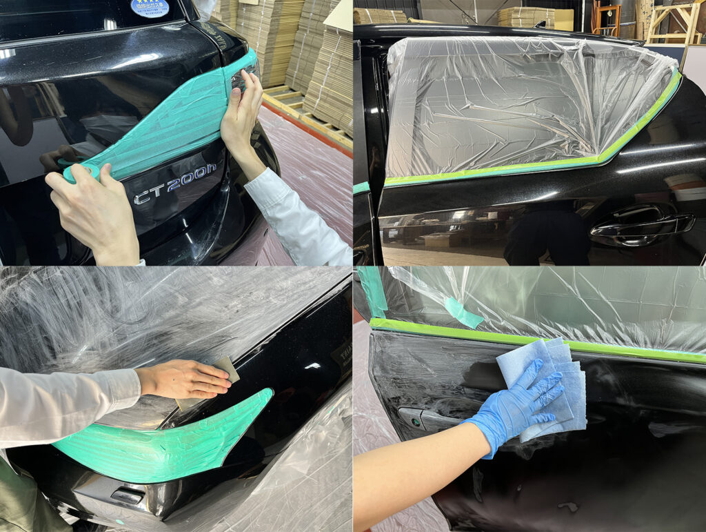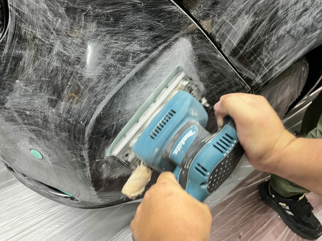 塗らない部分をマスキングし、車体全体の足付け(やすりがけ)を行います。