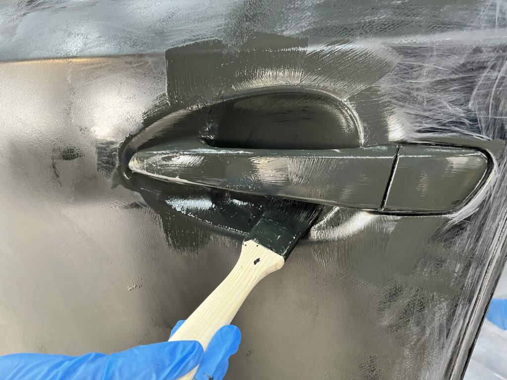 ドアノブやエンブレム、車体のエッジなどの細かい部分を刷毛で塗ります。