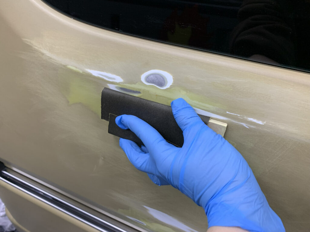 パテの成形には120番の粗めのサンドペーパーを使用していたため、表面をなめらかにする目的で240番 → 400番の順に、軽く表面を整えていきます。
