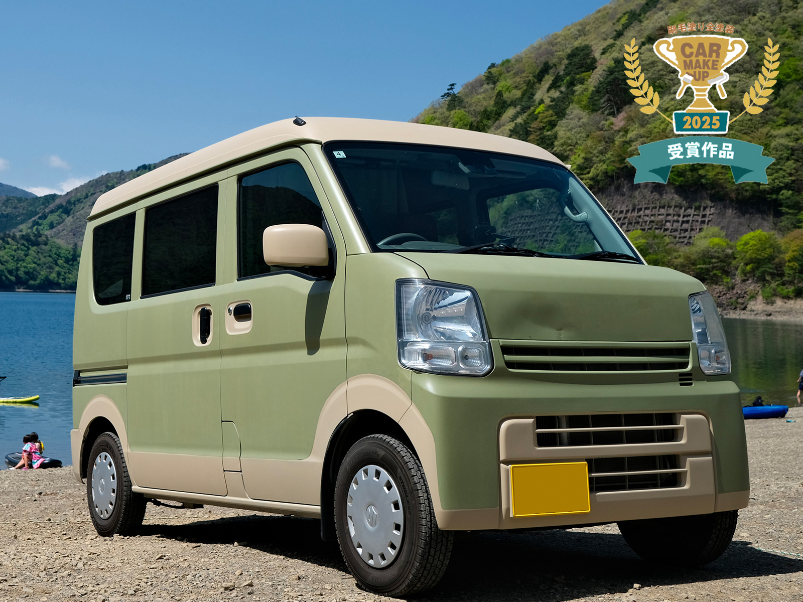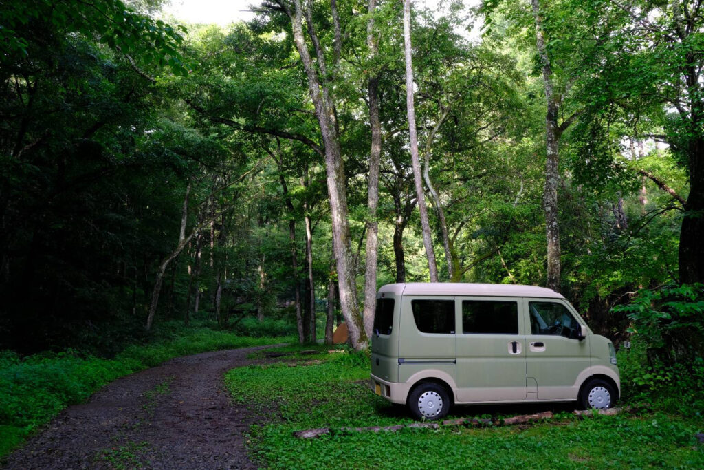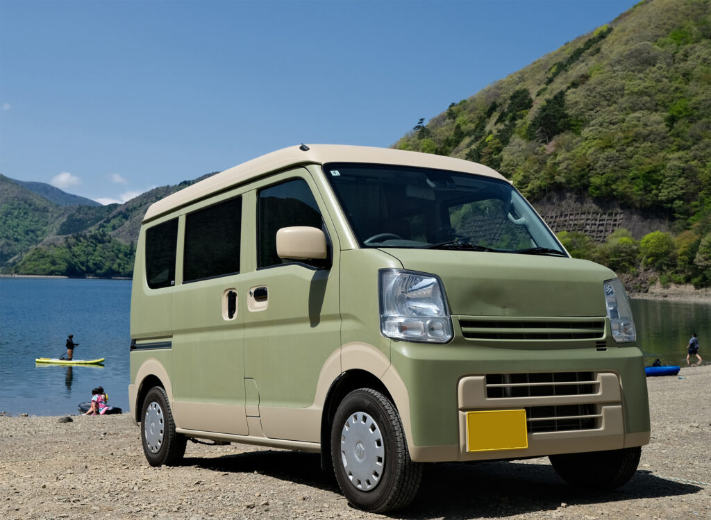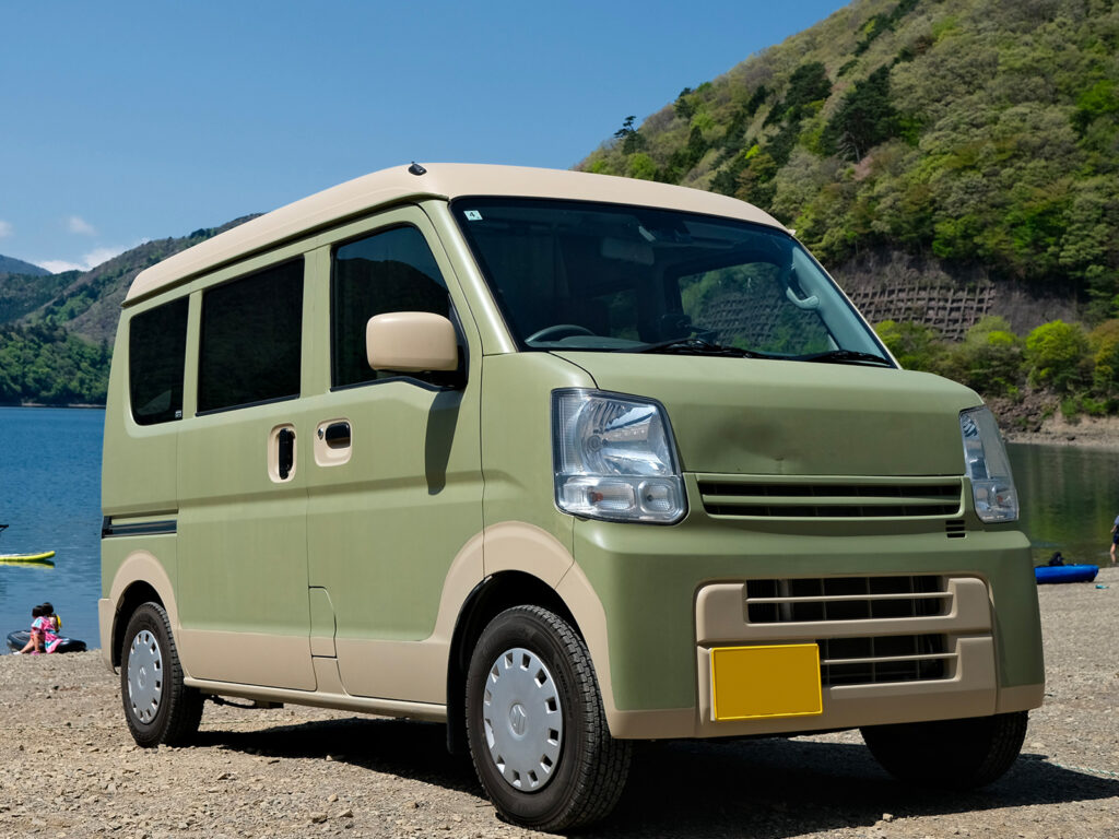 キャンプ場の森林や、湖畔の景色にもよく馴染む、とっておきのエブリイに生まれ変わりました。